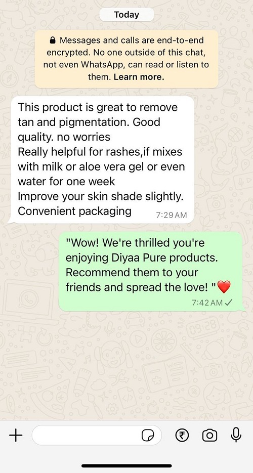 Very good results and good product. I tried many it was failed even I thought this will also not work out but after using its amazing results and now my friends family are asking your skin tone changed and looking good so i suggested our Diyaa product,, ????